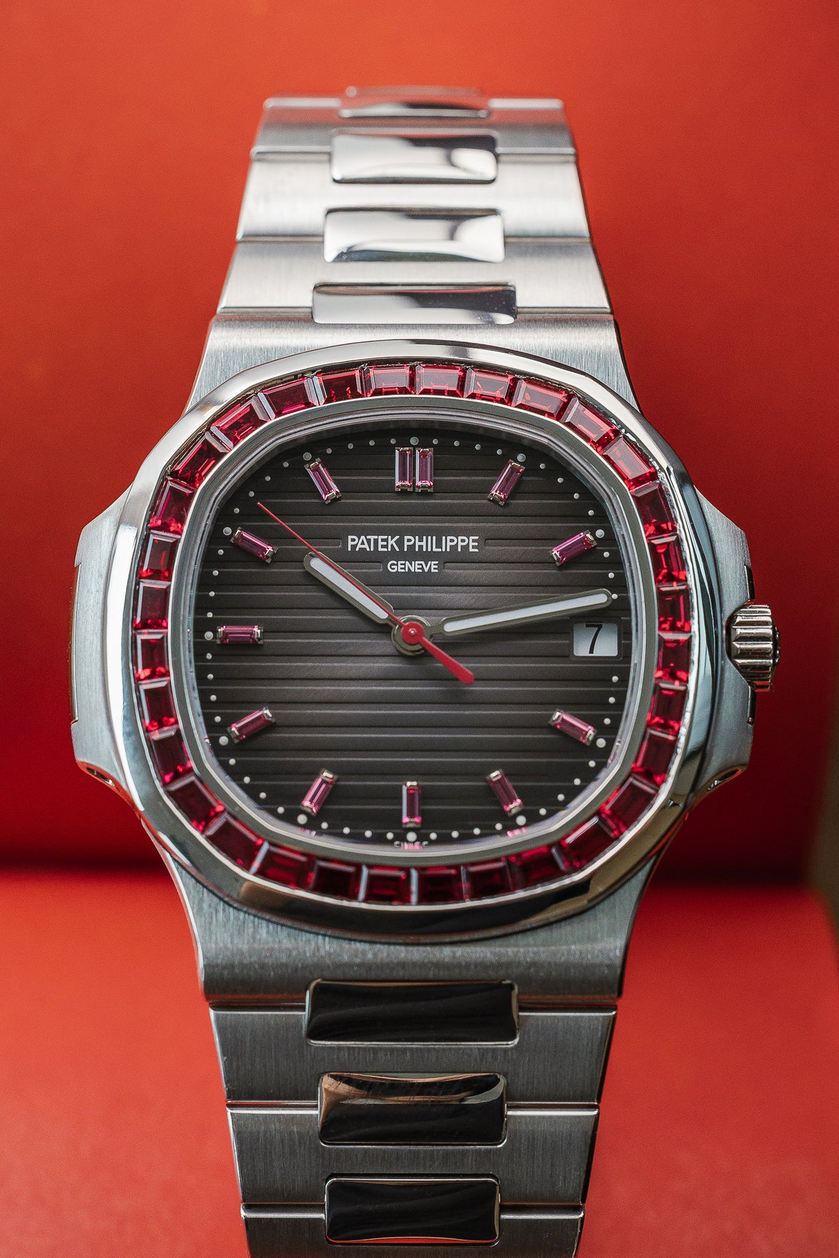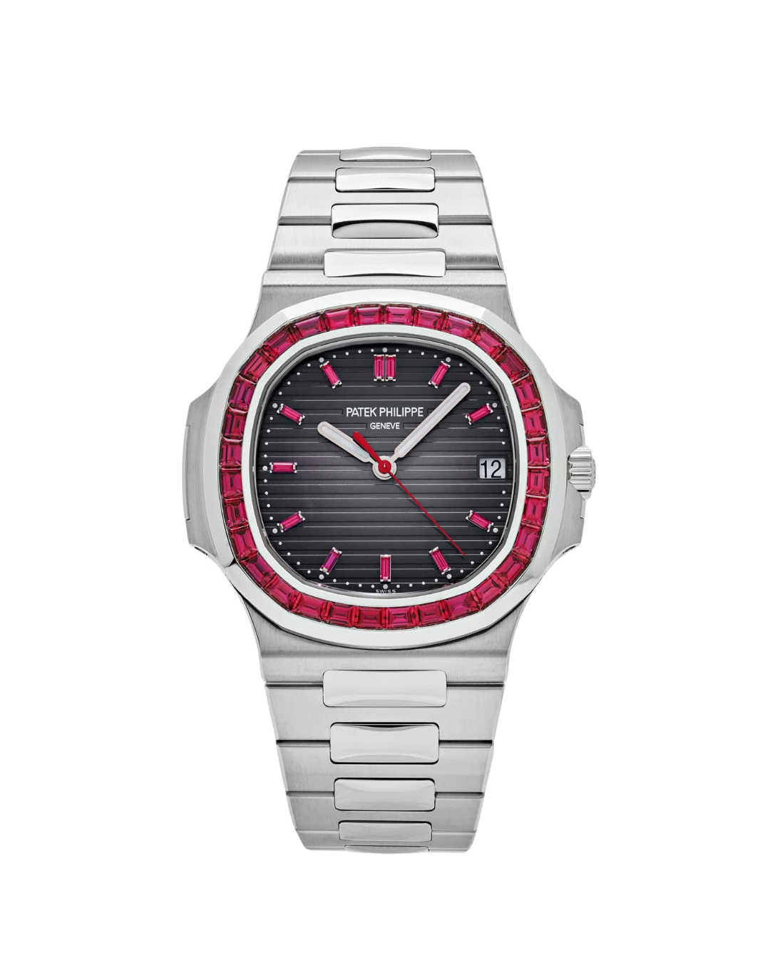 The Patek Philippe 5711/112P-001 Nautilus is an exclusive and highly collectible luxury timepiece crafted in solid platinum, distinguished by its striking grey sunburst dial, brilliant long baguette ruby-set bezel and platinum bracelet with integrated design; featuring automatic self-winding movement, luminescent hands and markers, and date display — an extraordinary fusion of iconic sport-elegant style, haute craftsmanship and refined exclusivity for discerning collectors and enthusiasts.